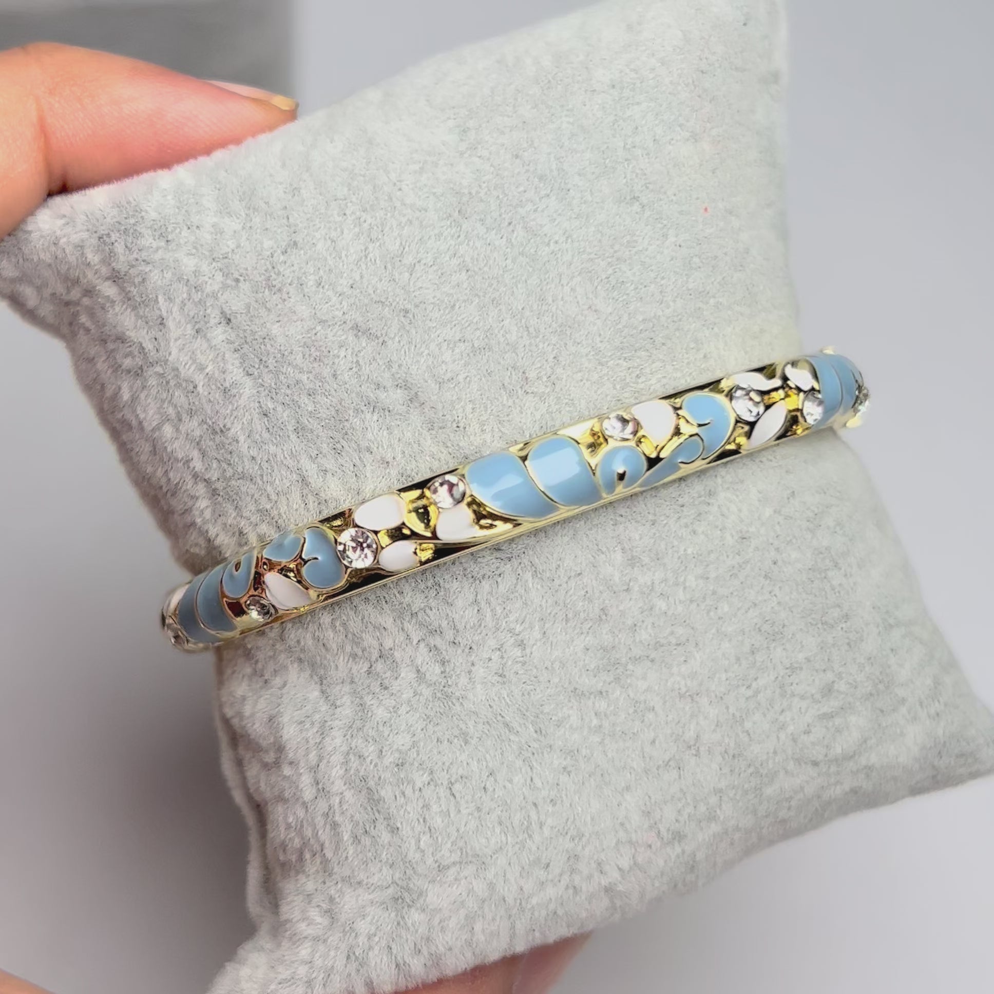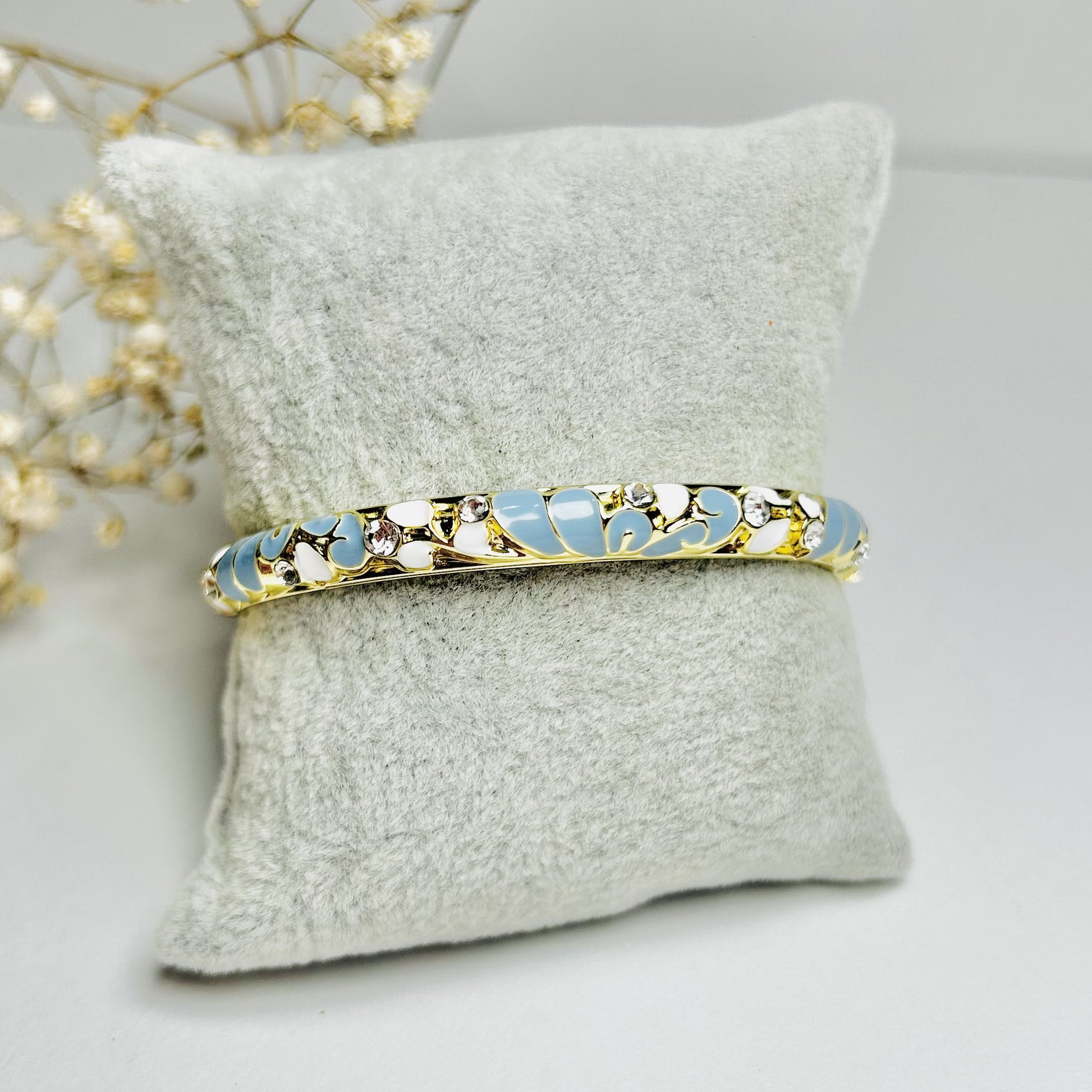 A dreamy sky-blue enamel cuff with floral-inspired mosaics and sparkling crystals for a soft vintage elegance. Perfect to brighten up any outfit with subtle charm. It's Anti-tarnish, waterproof, and openable for lasting shine and ease.