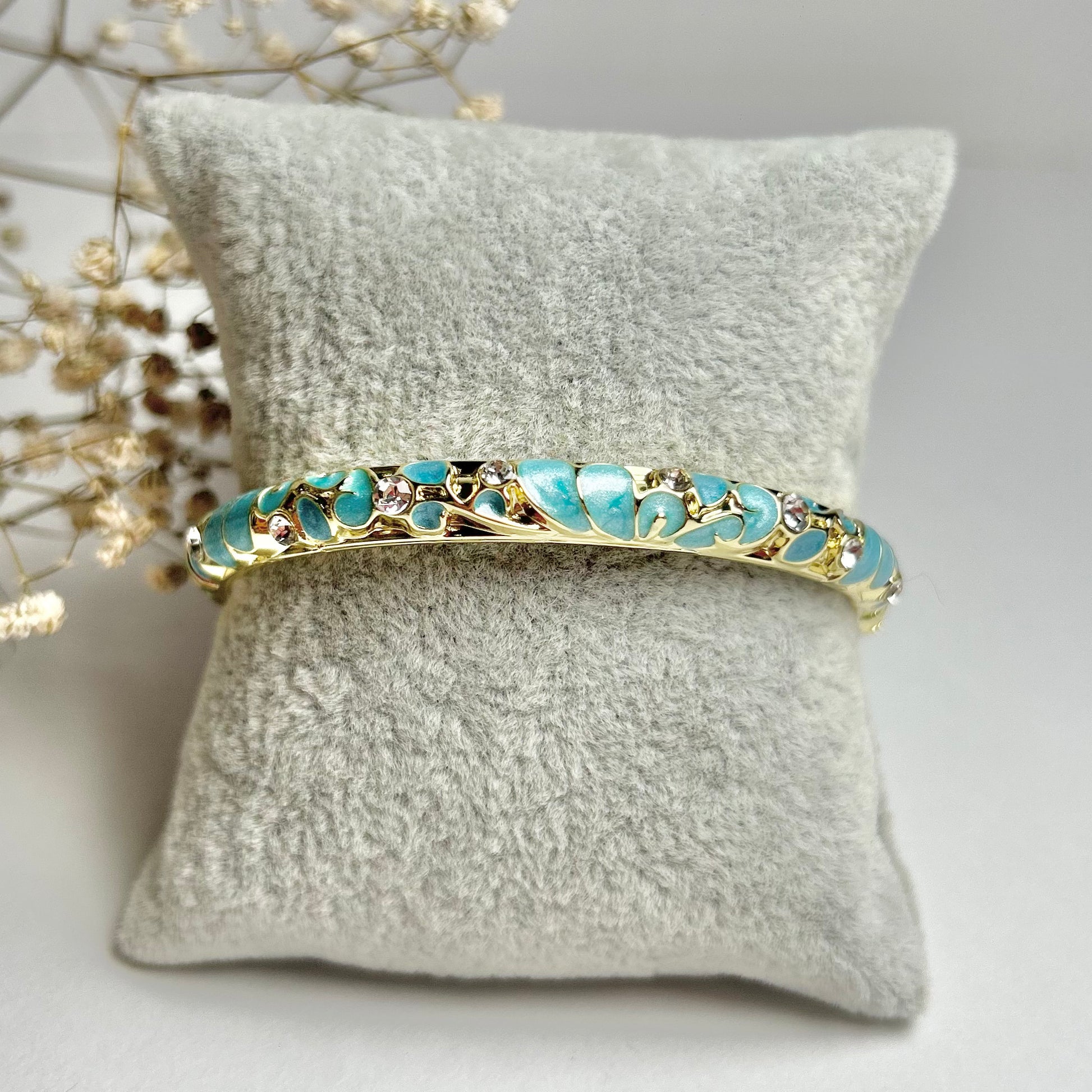 An aqua enamel cuff with golden mosaics and sparkling crystals, evoking the calm freshness of coastal waters. A refreshing pop of color for any look. It's Anti-tarnish, waterproof, and openable for lasting shine and ease.